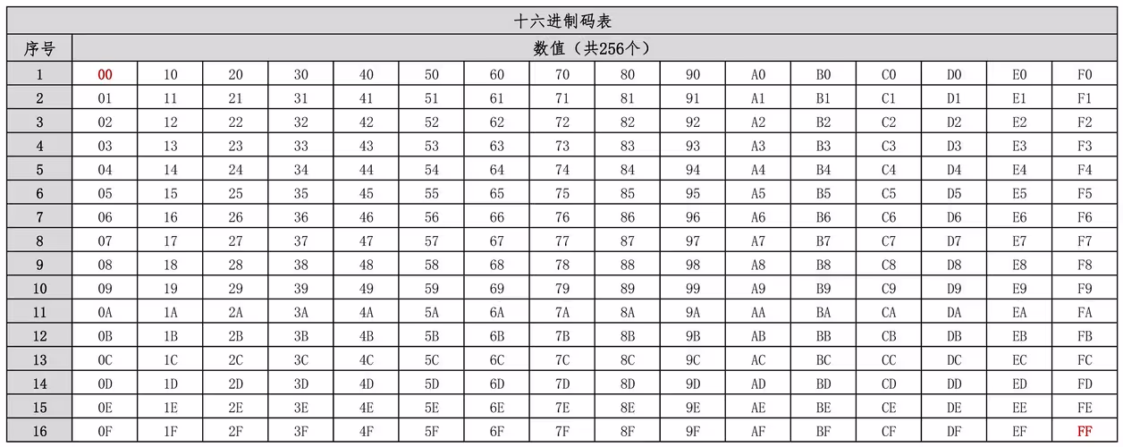 从左上00开始,往下递增,直到右下FF结束